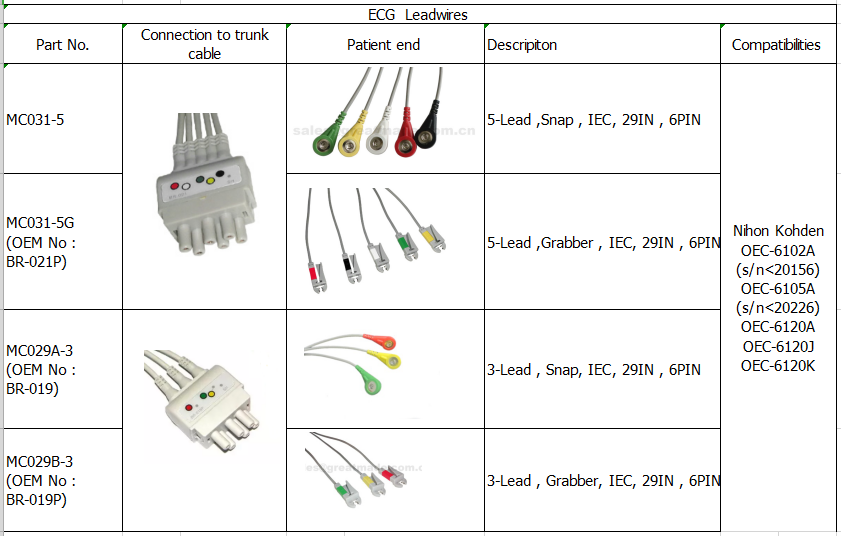 Nihon Kohden BR-019P, BR-021P 3/5 uçlu EKG Leadwire seti, geçmeli / Grabber ile uyumlu